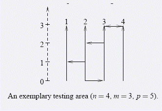 成都的驾驶考试在一个有n条平行的自南向北的单向的道路的场地中进行。每条道路长度为m米,并且都在同一