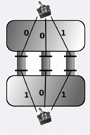 接下来n行每行包含了一条通道的信息, 由四个整数a; S a; b; S b表示. a和b表示控制两个水闸的开关编号,而S a和S b为0或1, 表示水闸受开关控制的方式. S i = 0表示开关i关时水闸关, 以此类推.