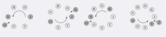 Game Johnny最近在玩报数游戏,首先他把一些字母先成一个圈,然后他选择其中一个字母作为开始的位置,逆时针报数,每报到k,则考察当前的字母,把当前字母的下一个字母插入在当前的下一个位置中,举个例子,比如当前的字母是A,则把B插入当前的位置之后,如果当前的字母是C,则把D插入当前位置之后,如果当前位置是Z,则把A插入当前位置之后,并从插入的位置接着报数。如下图。