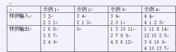 包含n行,每行m个1~n×m的正整数,各不相同,以空格分开。如果有多解,输出任意一组解;如果无解,输出一个整数0。