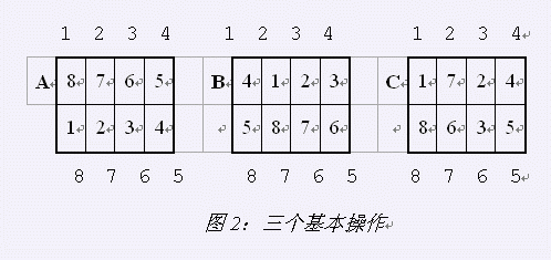 图2描述了上述3种操作的具体含义,图中方格外面的数字标识魔板的8个方块位置,方格内的数字表示此次操作前该小方块所在位置。即:如果位置P中有数字I,则表示此次操作前该方块在位置I。