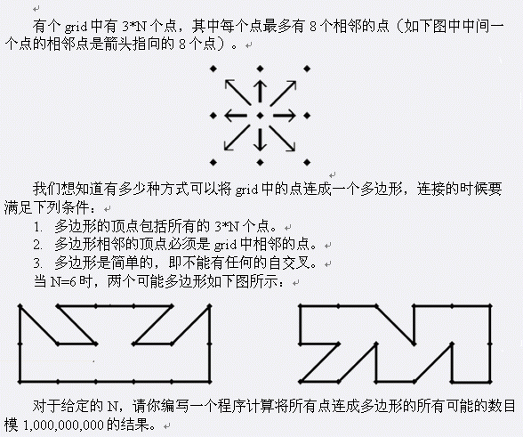 包括一个整数,即将所有点连成多边形的所有可能的数目模1,000,000,000的结果。