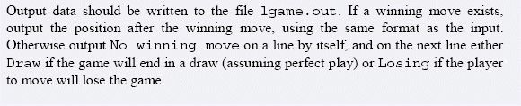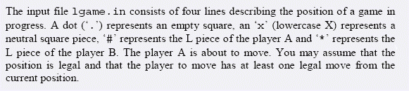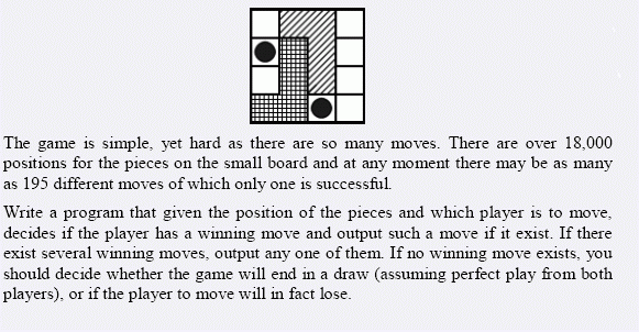 一个4*4的棋盘,放有两个L形和两个小圆球;其中一个L形被先手控制、另一个被后手控制。 两个人轮流走棋。一个人每一步可以将L形拿起然后重新放入棋盘中的任何新位置(不能放在原来的位置,可以翻转、旋转) 然后他可以选择任意一个小圆球移动到新的位置、也可以不移动小圆球,这由他决定。 一旦某人不能走了,就输了。输入一个状态,判断先手是必胜、必败还是平局。(假设两个人都足够聪明)
