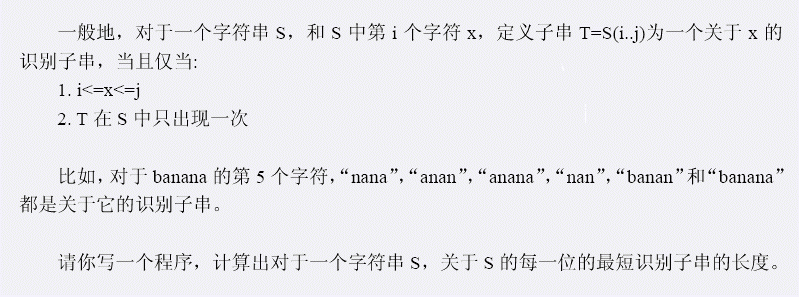 L行,每行一个整数,第i行的数据表示关于S的第i个元素的最短识别子串有多长.