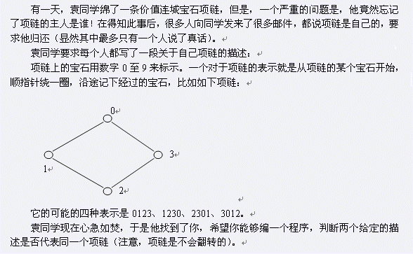 给定两个项链的表示,判断他们是否可能是一条项链。