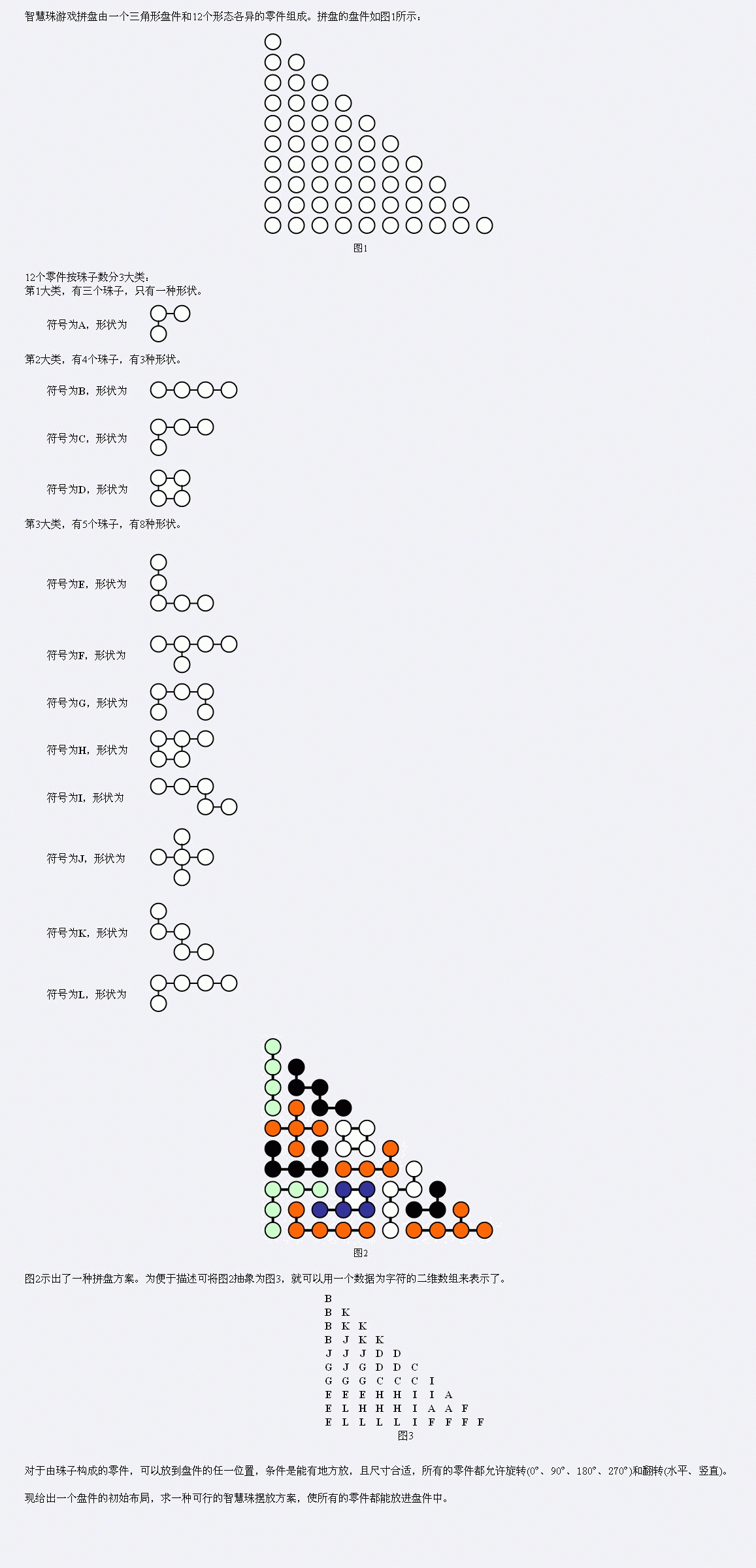 如果第i行的第j个字符是字母”A”至”L”中的一个,则表示第i行第j列的格子上已经放了零件,零件的编号为对应的字母。