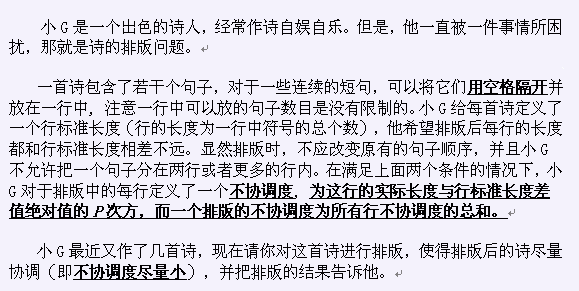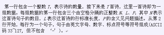 前两组输入数据中每行的实际长度均为6,后两组输入数据每行的实际长度均为4。一个排版方案中每行相邻两个句子之间的空格也算在这行的长度中(可参见样例中第二组数据)。每行末尾没有空格。