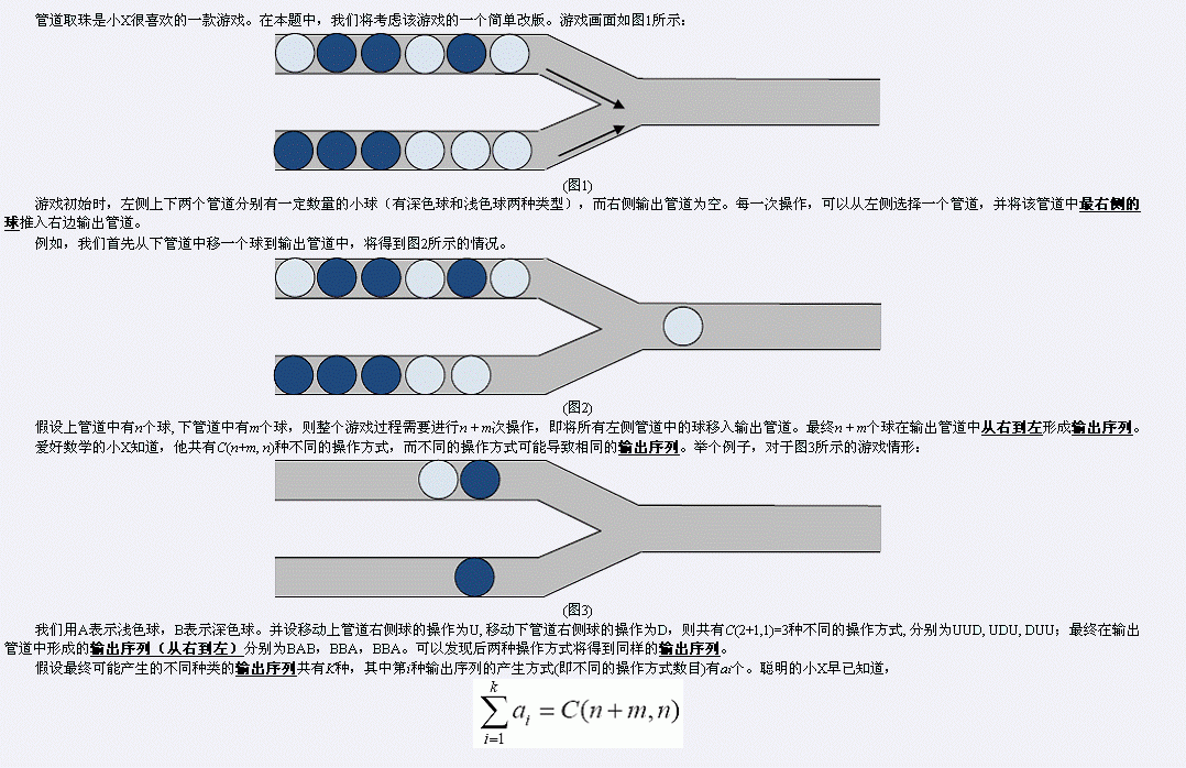 样例即为文中(图3)。共有两种不同的输出序列形式,序列BAB有1种产生方式,而序列BBA有2种产生方式,因此答案为5。 【大致数据规模】 约30%的数据满足 n, m ≤ 12; 约100%的数据满足n, m ≤ 500。