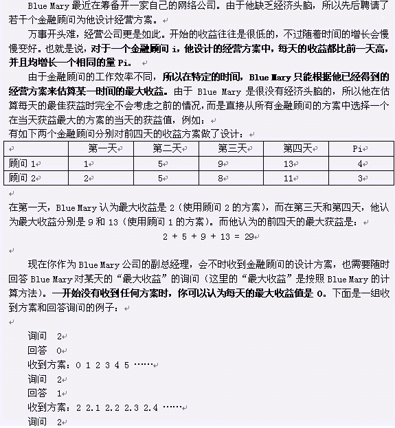 若单词为Query,则后接一个整数T,表示Blue Mary询问第T天的最大收益。