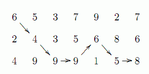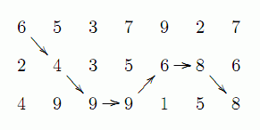 最近,奶牛们热衷于把金币包在面粉里,然后把它们烤成馅饼。第i块馅饼中含有Ni(1<=Ni<=25)块金币,并且,这个数字被醒目地标记在馅饼表面。 奶牛们把所有烤好的馅饼在草地上排成了一个R行(1<=R<=100)C列(1<=C<=100)的矩阵。你现在站在坐标为(1,1)的馅饼边上,当然,你可以拿到那块馅饼里的所有金币。你必须从现在的位置,走到草地的另一边,在坐标为(R,C)的馅饼旁边停止走动。每做一次移动,你必须走到下一列的某块馅饼旁边,并且,行数的变动不能超过1(也就是说,如果现在你站在坐标为(r,c)的馅饼边上,下一步你可以走到坐标为(r-1,c+1),(r,c+1),或者(r+1,c+1)的馅饼旁边)。当你从一块馅饼边经过,你就可以拿走馅饼里所有的金币。当然啦,你一定不会愿意因半路离开草地而失去唾手可得的金币,但,最终你一定得停在坐标为(R,C)的馅饼旁边。 现在,你拿到了一张标记着馅饼矩阵中,每一块馅饼含金币数量的表格。那么,按照规则,你最多可以拿到多少金币呢? 比方说,奶牛们把馅饼排成如下的矩阵,矩阵中的数字表示该位置的馅饼中含金币的数量: