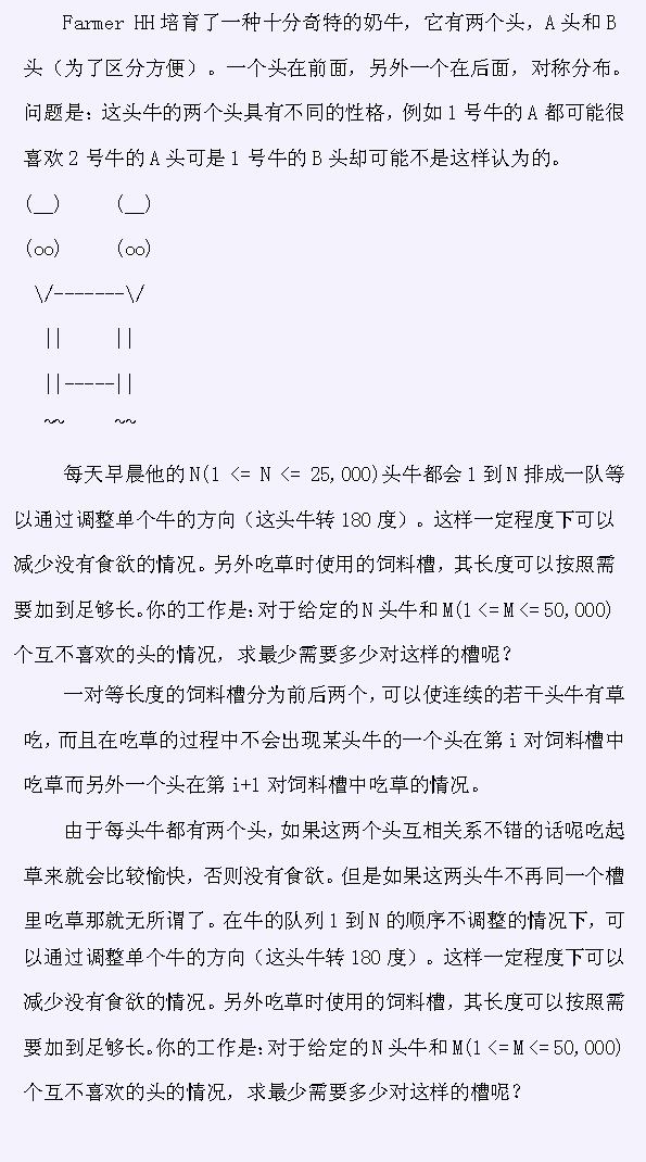 第一行有两个整数,N和M。 下面M行,每一行有一对互不喜欢的头的情况。如4 A 3 B,表示4号牛的A头不喜欢3号牛的B头。