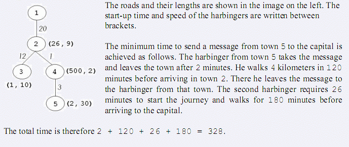 每个邮递员出发需要一个准备时间W[I],他们的速度是V[I],表示走一公里需要多少分钟。