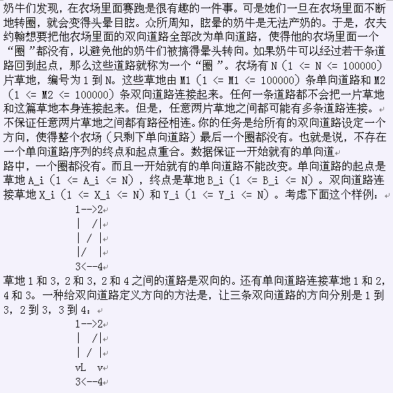 * 第1到M2行: 第i行应该包含两个由空格隔开的整数: 根据你给第i条双向道路定义的的方 向,可能是X_i, Y_i,也可能是Y_i, X_i。这些双向道路必须按照输入的顺序 输出。如果无解,在单独的一行内输出"-1"。