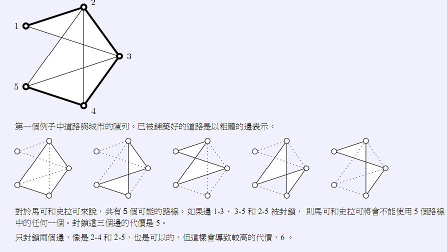 马克和斯拉夫克的竞争者决定在某些未经铺设的土路上设置路障,使得他们两人不可能找到满足上述要求的训练路径。已知在每条土路上设置路障都有一个费用值(一个正整数),并且竞争者不能在铺设好的道路上设置路障。