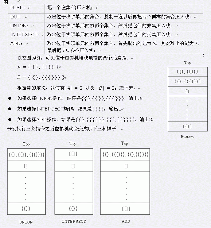 中学数学里集合的元素往往是具体的数字,比如A = {1,2,3},B = {}(空集)等等。但是要特别注意,集合的元素也可以是另一个集合,比如说C = {{}},即说明C有且仅有一个元素——空集B,所以称B是C的子集或者称B是C的元素都是正确的。所谓一个集合的势,就是这个集合的元素个数,一般记为|S|,空集的势为0。在上例中,|A| = 3,|B| = 0,|C| = 1。 鉴于集合论是现代数学的基础理论这一事实,一群异想天开的科学家开始着手建造一台新式的超级计算机——集合堆栈机Alpha,这台机器操作的将是集合而不是数字。不过由于Alpha的竣工之日遥遥无期,科学家们希望你为他们编写一台虚拟机,好让他们检查自己的原型设计是否合理。 Alpha的存储设备只有一个栈,栈的每个单元都只能放置一个集合。一开始,栈是空的,在每个操作结束后,计算机就会输出位于栈顶单元的那个集合的势。Alpha拥有五种不同的指令,分别为:PUSH、DUP、UNION、INTERSECT和ADD,他们的功能如下: