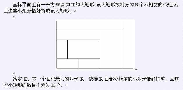 所有数据都是非负整数。第一行为 W、H (不超过10000),表示大矩形的长和宽。第二行为N、K(1 ≤ K ≤ N ≤ 2000)。接下来 N行,每行四个整数X1、Y1、X2、Y2,表示小矩形对角两顶点的坐标,满足 0 ≤ X1 < X2 ≤ W 0 ≤ Y1 < Y2 ≤ H