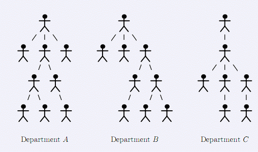 在很久很久以前,某国政府成立了一个精简机构部,你可以认为它是个最大的部,公务员的数量的确很多,然后,他们的结构却相当简单,部长最多有3个下属,这些下属也最多只能有3个下属,等等。最近,心选了一个部长,他年轻、英俊兵充满了才华,他决定从他的部门开始实行机构精简,他发现部门分级结构的许多部分是一样,因此,他们肯定是在做相同的工作,无论什么时候,两个相同的部分作同一项工作,必然有一个部门没事干。因此,该部门所有的这些都是多余的。你的任务就是找出多少个完全不相同的部门实现该次精简任务。 任务 给你一个部的组织结构图,每个公务员只有一个上级,最多有3个下级(包括0个),注意部长没有上限,但也最多只有3个下级,下级之间都是平等的,没有级别大小之分。一个部门包含一个官员和他的下级,他下级的下级等等,有两种特殊情况:由部长开始的所有人构成的部门和只有1个人没有任何下属的部门。部门的深度是由部门官员连接起来的一个链X1,……,Xd,其中,对每个1≤i≤d,Xi是Xi+1的上级,只有一个人的部深度为1。两个部门A和B的结构完全相同是指对于部门A的每个官员X有部门B的官员X’与之对应,反之,对于部门B的每个官员X’有部门A的官员X与之对应。特别地,对于所有的官员X和Y:X是Y的上级当且仅当X’(相对于官员X)是Y’(相对于官员Y)的上级。如果部门A和部门B结构相同,那么两部门的领导相对应,深度相同,人数相等。在下面的图中,部门A和部门B结构相同,而部门C的结构与A、B不同。你的任务是决定对于所有的深度不同结构部门的数目,换句话说,你必须提供这样一个序列,n1,……,nd,d是部的深度,对每个i,包含深度位i的完全不同结构部门的数目。
