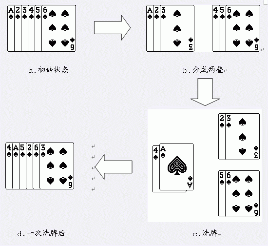 从图中可以看出经过一次洗牌,序列1 2 3 4 5 6变为4 1 5 2 6 3。当然,再对得到的序列进行一次洗牌,又会变为2 4 6 1 3 5。