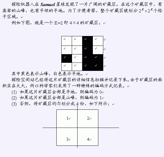 第一行有一个整数K,表示有矿藏区的规模为 (1 < K < 50)。第二行有一串编码,有0、1组成,长度不超过200,表示该矿藏区的编码。