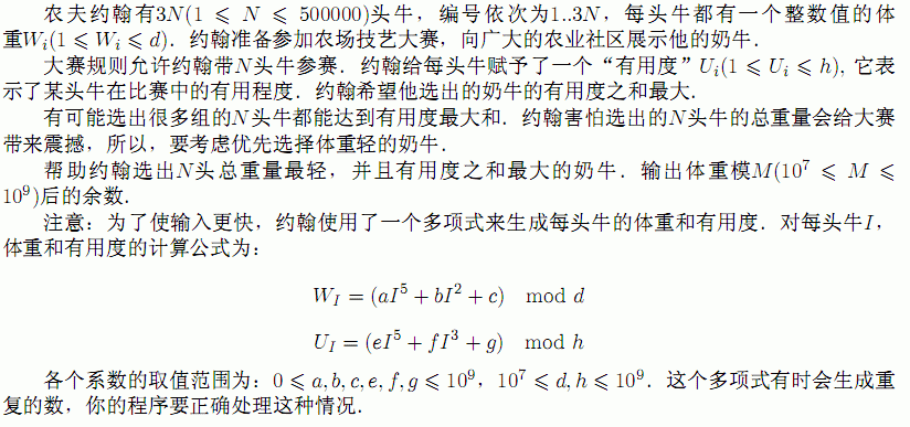 第1行:满足总重量最轻,且用度之和最大的N头奶牛的总体重模M后的余数。