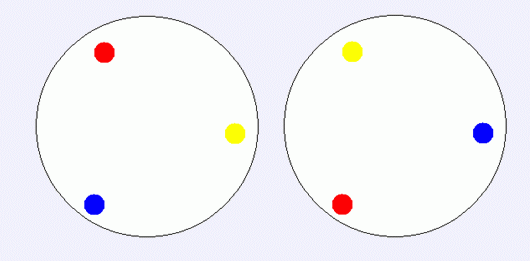 因为纪念币是圆的,所以如果两种“宝石颜色的排布”如果经过旋转后对应位置的颜色相重合,就认为他们是相同的排布方式(请注意:纪念币只有一面镶宝石,所以两种排布若经过翻转以后是可以重合的,但只经过旋转无法使两者重合,则认为他们是不同的排布)。例如下面的两种排布方式就是相同的: