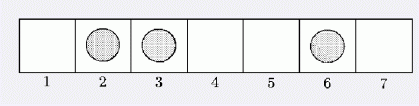 让我们考虑一个在m x 1 的板子上玩的游戏,板子被从1 到 m编号. 现在板子上有n 个棋子, 每个都严格占据板子上的一个格子. 没有一个棋子占据格子m. 每个单独的移动遵循以下原则: 移动的人选择一个棋子把它移动到比它大的格子中第一个未被占领的格子里去. 两个选手交替移动, 谁先占据格子m, 谁赢. 下面是一个例子(m = 7), 一个选手可以把2 移到 4, 把3 移到 4 或者把6 移动到 7.