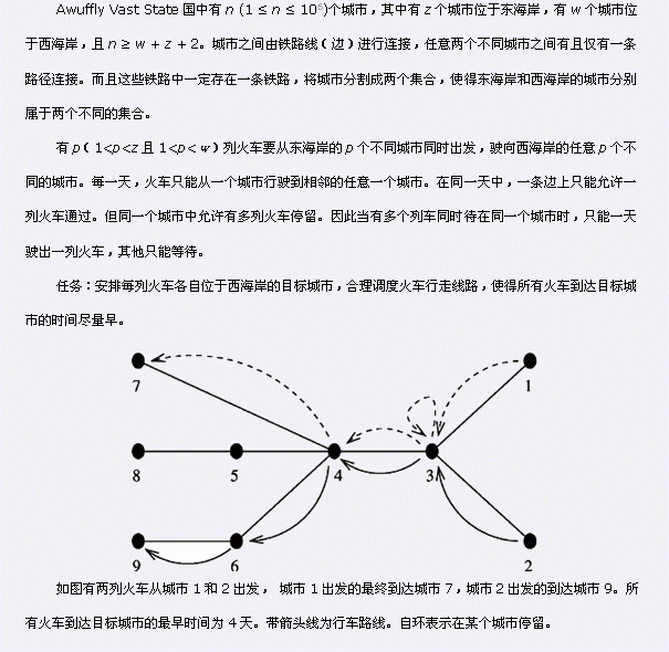 第一行三个整数1 < n, w, z < 106, n >= w+z+2, 城市从1...n标号, 东海岸的w 个城市标号1..w,西海岸的z个城市标号n-z+1..n. 接下来n-1 行表示铁路网络,每行两个数表示铁路连接的两个城市. 接下来一行一个整数p, 1 < p < w, 1 < p < z, 表示有p趟火车,接下来p个整数表示p趟火车出发的东海岸城市编号.