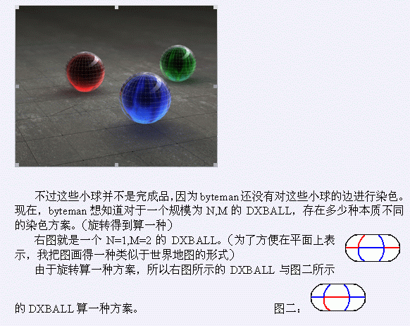 在byteland的手艺工人byteman会制作一种称为DXBALL的网状小球,这种小球形如鸟笼,由N个等分的纬线与M个等分的经线组成,如下图所示: