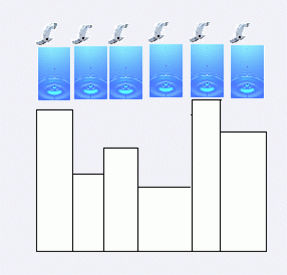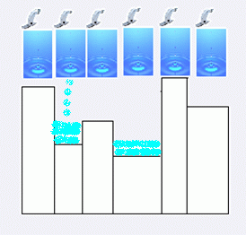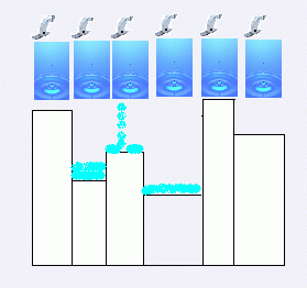 一天,陈启峰在洗衣服的时候突发奇想,发明了一种音乐水栅。音乐水栅是这样子的:它的下部是N个长方体的音乐木块并列组成的。每个木块的长度都是1,而宽度可能各不相同。为了没有重复的音调,陈启峰使得任意两块的高度都不相同。水栅前后被两块极大的玻璃夹着。在每一个音乐木块的中央上都有一个水龙头。当把它开启后,水就会掉下来,与木块发生非弹性碰撞时发出轻脆、优雅、动听的声音。下图为正视图: