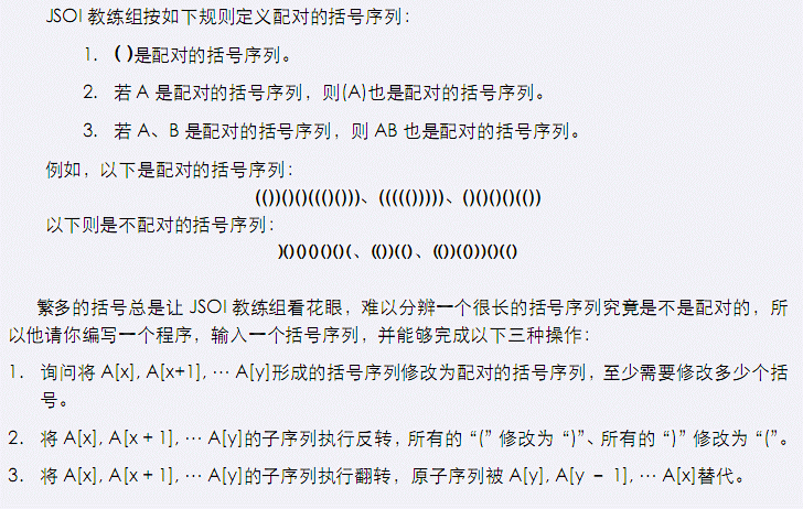 输入数据的第一行包含两个整数N和Q,分别表示括号序列的长度,以及操作的个数。 第二行包含一个长度为N的括号序列。 接下来Q行,每行三个整数t、x和y,分别表示操作的类型、操作的开始位置和操作的结 束位置,输入数据保证x不小于y。其中t=0表示询问操作、t=1表示反转操作、t=2表示翻转操 作。