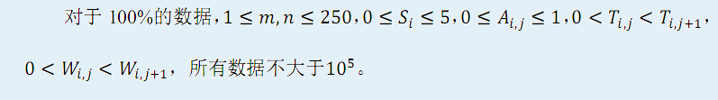 下面m个部分,第i部分描述员工i的愤怒值与产品数量的函数关系。每一部分由三行组成:第一行为一个非负整数Si,第二行包含Si个正整数,其中第j个正整数为Ti,j,如果Si=0那么输入将不会留空行(即这一部分只由两行组成)。第三行包含Si+1个正整数,其中第j个正整数为Wi,j。