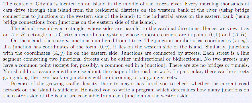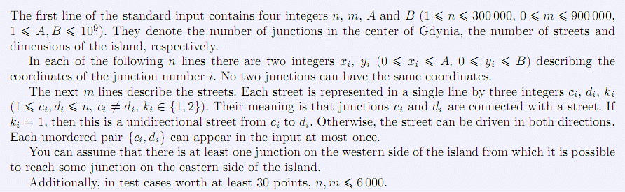 如果ki=1,表示从ci到di的街道是单向的,否则,这条街道可以双向行驶。每个无序对{ci, di}最多出现1次。