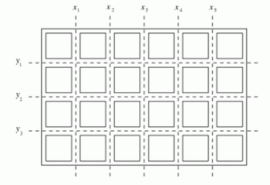 我们先沿着三条横线切割,需要3刀,得到4条巧克力,然后再将这4条巧克力沿竖线切割,每条都需要5刀,则最终所花费的代价为y1+y2+y3+4*(x1+x2+x3+x4+x5)。