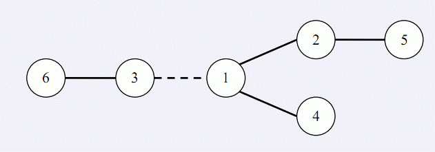 意修建恰好 n – 1条双向道路。 每条道路的修建都要付出一定的费用, 这个费用等于道路长度乘以道路两端的国家个数之差的绝对值。例如,在下图中,虚线所示道路两端分别有 2 个、4个国家,如果该道路长度为 1,则费用为1×|2 – 4|=2。图中圆圈里的数字表示国家的编号。