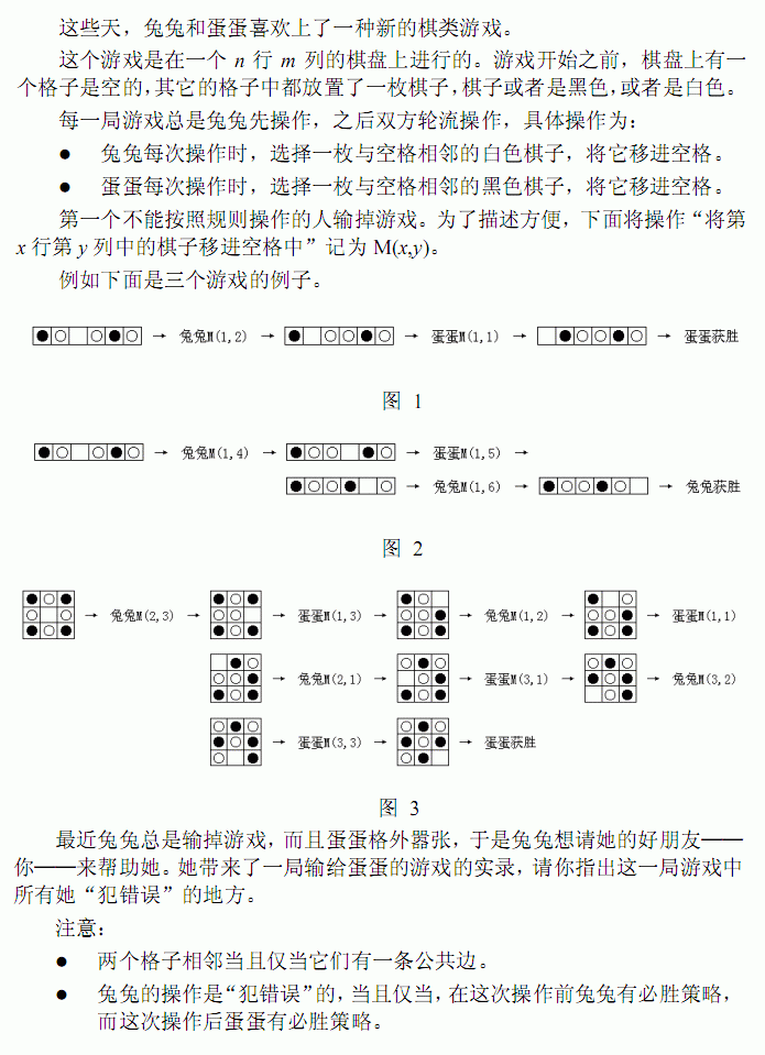 输入保证整个棋盘中只有一个格子没有棋子, 游戏过程中兔兔和蛋蛋的每个操作都是合法的,且最后蛋蛋获胜。