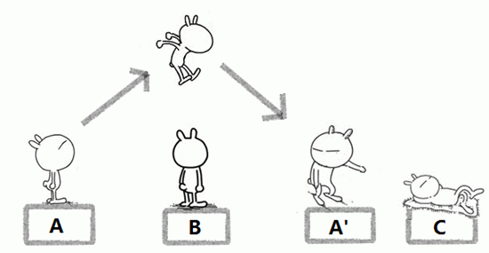 游戏在一个无限长的由树桩组成的直线上进行,相邻两树桩距离相同,为了方便表示,兔子们把树桩标号为…,-2,-1,0,1,2,…。游戏开始时,三只兔子站在不同的三个树桩上。游戏中,兔子可以跳过另一只兔子到达轴对称的那个树桩上。
