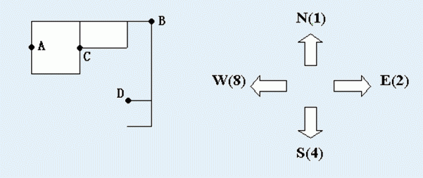 从第2行到第m+1行为下水道结构图。我们用方向数1代表N(北),用方向数2代表E(东),用方向数4代表S(南),用方向数8代表W(西)。第i+1行的第j个数字ci,j代表点(i,j)处有管道连接的所有方向数之和,如上图中的点B的方向数之和为12。