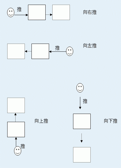 有一个仓库被分成n*m 个矩形区域,如果两个区域有一条公共边,则被认为这两个区域相邻。包裹都放在一个区域中,剩余的区域或者空闲或者被集装箱占有,这是因为集装箱太重,仓库管理员不能将集装箱搬走。仓库管理员目是是要将包裹从开始的P区域移动到最后的K区域。他可以从空区域走到与之相邻的一个空区域。当仓库管理员走到与包裹相邻的区域时,它可以推动包裹,具体的推动方法如下所示: