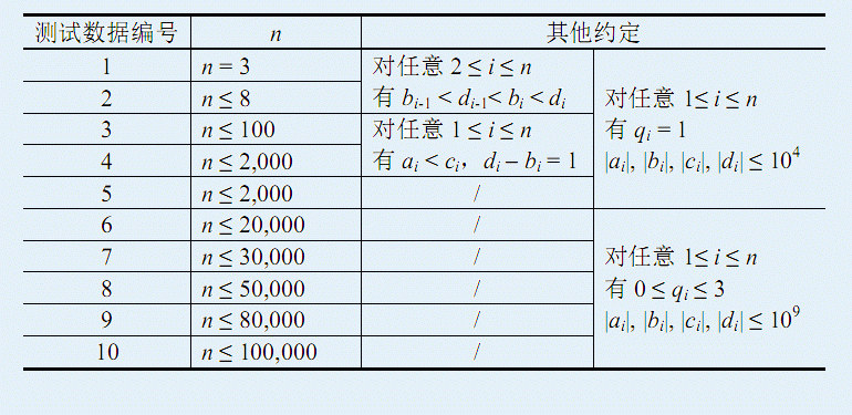 接下来 n行,每行 4个整数,描述针叶的位置信息。其中第 i 行的整数为 ai,bi,ci,di,表示编号为 i 的针叶所抽象成的线段的端点为(ai, bi)和(ci, di)。 接下来 n 行,每行 2 个整数,描述移动操作。其中第 i 行的整数为 pi,qi,表示第 i 轮移动的针叶编号为 pi,方向为 qi。其中 qi为一个 0 到 3 之间的整数,0 表示向左平移(即 x 轴负方向) ,1 表示向上平移(即 y 轴正方向) ,2 表示向右平移,3表示向下平移。