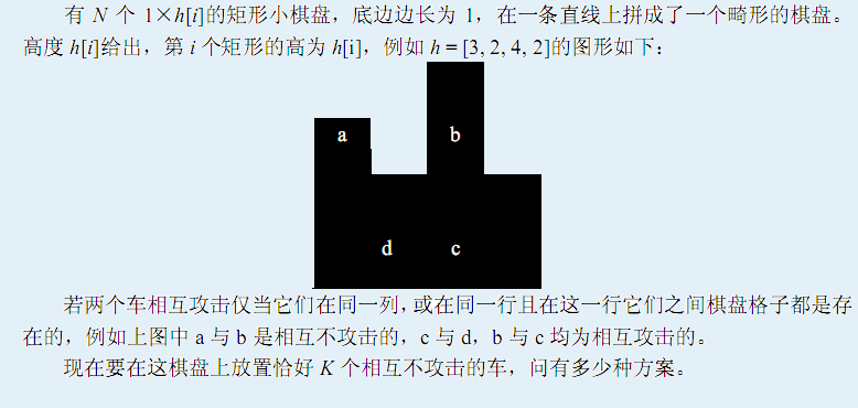 第1行包括两个正整数N,K,表示了棋盘的列数和放的车数。 第2行包含N个正整数,表示了棋盘每列的高度。