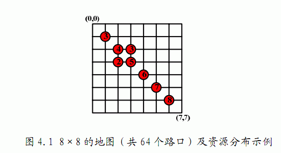 在野外生存中,以最快、最省力的方式收集必要的生存资源是必须的。在这 次生存训练的尾声,给队员们的最后考核就是收集资源竞赛,要求队员们在限定 时间内收集到最多的资源。小龙抽到的地图是震后城市生存资源收集模拟,教官 为小龙发了一张地图,地图上的南北和东西方向各有N条间距相等的街道,如果 街道的交叉点即路口上标注着红点和数字,这代表该路口有一定量的资源可以收 集(如图4.1),否则表示该路口没有资源。小龙决定利用赛前准备时间好好研 究一下行走路线,根据地图上的比例尺提示,他知道从模拟城市的一个路口走到 临近的下一个路口,大概需要1分钟,而需要收集的资源就放在路口中心,拿起 来就可以继续行进,因此,行走需要时间,而收集资源的时间是可以忽略不计的。 请为小龙设计一个行走方案,使得他在限定时间内能收集到最多的资源。