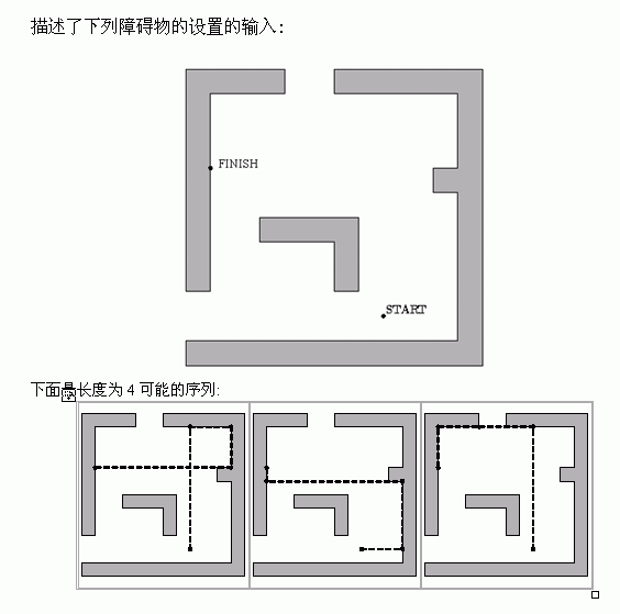 我们定义一个坐标系统来描述滑冰场物体的位置。滑冰场是一个顶点分别为(0,0),(10000,0),(10000,10000),(0,10000)的正方形。在输入文件LOD.IN的首行有两个被单空格号隔开的整数z1 和 z2 ,0<=z1, z2<=10000。数字对(z1, z2)表示起点的坐标。在文件的第二行有两个被单空格号分开的整数t1 和t2 (0<=t1, t2<=10000)。数字对(t1, t2)表示终点的坐标。在文件的第三行包含了一个整数s,(1<=s<=2500)。这是障碍物的数目。下面的几行是对障碍物的描述。每一个障碍物的描述由一行包括一个等于障碍物的墙数(底边)的正整数r开始。接下来的r行的每一行有两个由单空格号隔开的整数x和y。那是障碍物底部顶点的坐标,按照顺时针顺序给出。(当按照这个方向绕障碍物一圈,它的内部在左手边)。障碍物的墙的总数不超过10000。