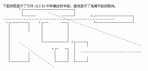 在接下来的n行的每一行有一个寺庙的描述(在第I行有第I个寺庙的描述)。寺庙的描述由四个非负的不大于8000的整数和字母E,W,S和N组成。头两个数字是寺庙的西北角的坐标,接下来的两个是相对的东南角的坐标。为了指定一个点的坐标,我们给出了它的地理精度,从西往东增加,纬度从南往北增加。描述的第五个元素代表入口的墙(E-东,W-西,S-南,N-北)。寺庙的描述元素由单空格隔开。