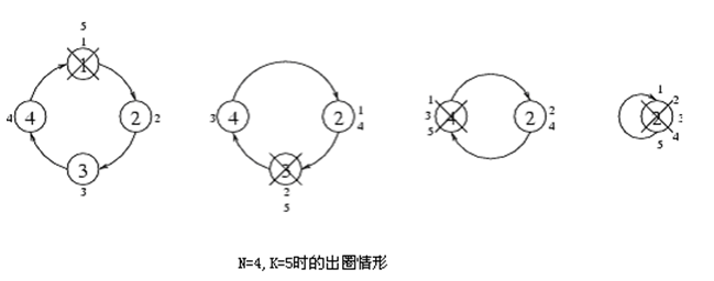 有编号从1到n的n个小朋友在玩一种出圈的游戏,编号为i+1的小朋友站在编号为i小朋友左边。编号为1的小朋友站在编号为n的小朋友左边。首先编号为1的小朋友开始报数,接着站在左边的小朋友顺序报数,直到数到某个数字K时就出圈。直到所有的小朋友都出圈,则游戏完毕。游戏过程如下图所示。
