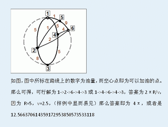 传说2012-12-21是世界末日啊!(虽然今天已经是2012-12-26了……)人们都要逃亡了。到处都是自然灾害,导致地球上只有n个地方可以存活了。其中,我们在s号点,喜马拉雅山在t号点。对于这n个点,我们会用(Xi, Yi, Zi)来描述这些点,而坐标原点则是地球中心。显然,这n个地点是不会靠在一起的,那么我们必须要用飞机来飞行。已知我们所坐的飞机会保持一个恒定的速度v,并有一个容量为c的油箱。刚出发时,油箱是满的。而这n个点之中,不是能够两两之间互相飞行的。可以飞的航线只有m条,而每一条所需的油量都不一样(双向航线)。更糟糕的是,不是所有的点都能加油,那么就意味着飞行员每到一个地点,就不得不把油加满!已知两点之间的距离为坐标之间的球面距离(因为是在地球上嘛),而飞行总时间为(总距离/v),那么我们要从s号点飞到t号点至少需要多少时间呢?答案保留10位小数。