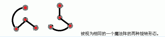 对于成型的结界,中心的魔法柱和周围的每个魔法晶石之间都有且只有1条通路,也就是说,由x个魔法晶石组成的成型的结界是由原始结界中删除x条魔法通路,使结界成为一个“树形”连通结构形成,我们称这个连通结构为“魔法阵”。由于魔法晶石是环绕魔法柱分布的,所以两个魔法阵是不同的魔法阵,当且仅当其中一个魔法阵不能通过旋转的方式与另一个魔法阵相同。