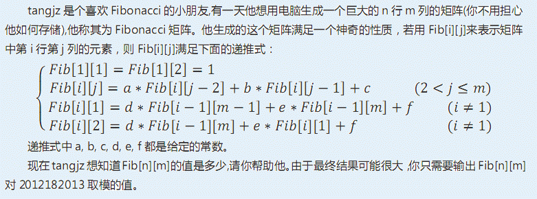 一个整数,表示Fib[n][m]对2012182013取模的值。