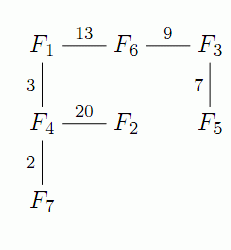第2到M+1行:每行包括4个分开的内容,F1,F2,三,D分别描述两个农场的编号,道路的长度,F1到F2的方向N,E,S,w.