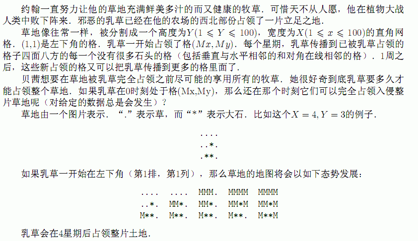 一个单独的整数表示最后一个不是大石块的格子被乳草占领的星期数