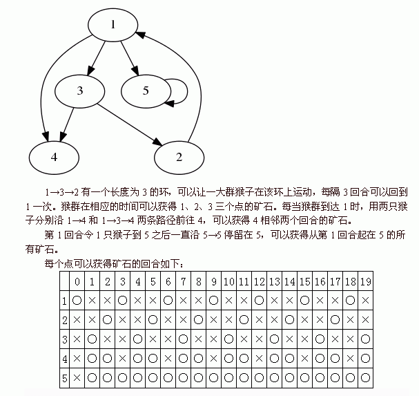 玩家只有一个,但他拥有无限数量的猴子。游戏最开始时,所有的猴子都在第1个点。每一回合,所有的猴子必须沿着图中的一条有向边移动到下一个点。玩家可以给不同的猴子指定不同的路线,但不能让猴子呆在原地不动。无路可走的猴子会在下一回合消失。